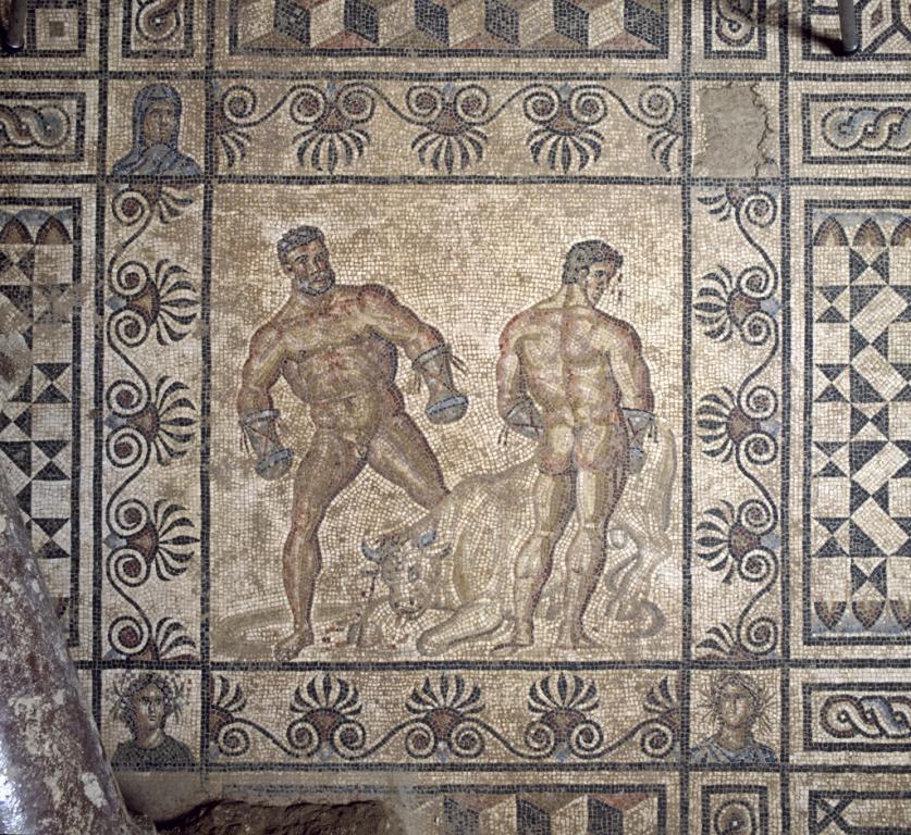 Légende : vue de la scène centrale du tapis de mosaïque représentant le combat d'Entelle et Darès ( IIè s. ap. J.C.)