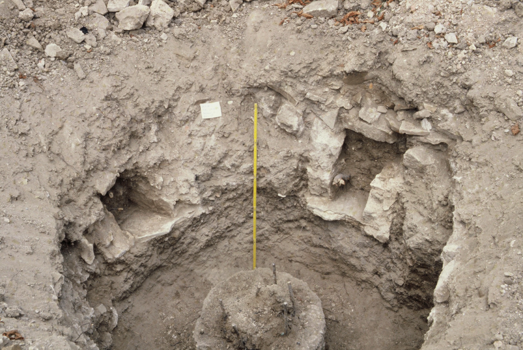 Vue plongeante prise vers le nord de deux caniveaux abîmés par le creusement d'un pieu à leur point de rencontre. Ces caniveaux font partie de la moitié nord du bâtiment A d'une maison dont la phase d'occupation était comprise entre la moitié du Ier siècle et le début du IIe siècle.