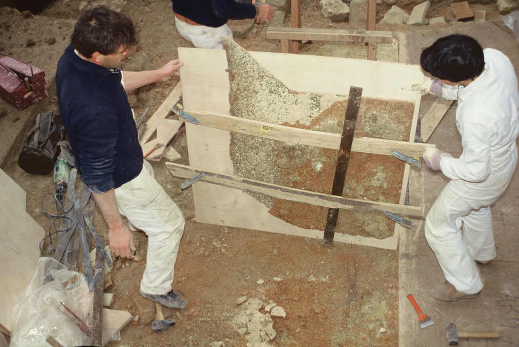 Vue plongeante du retournement d'une autre plaque de mosaïque.