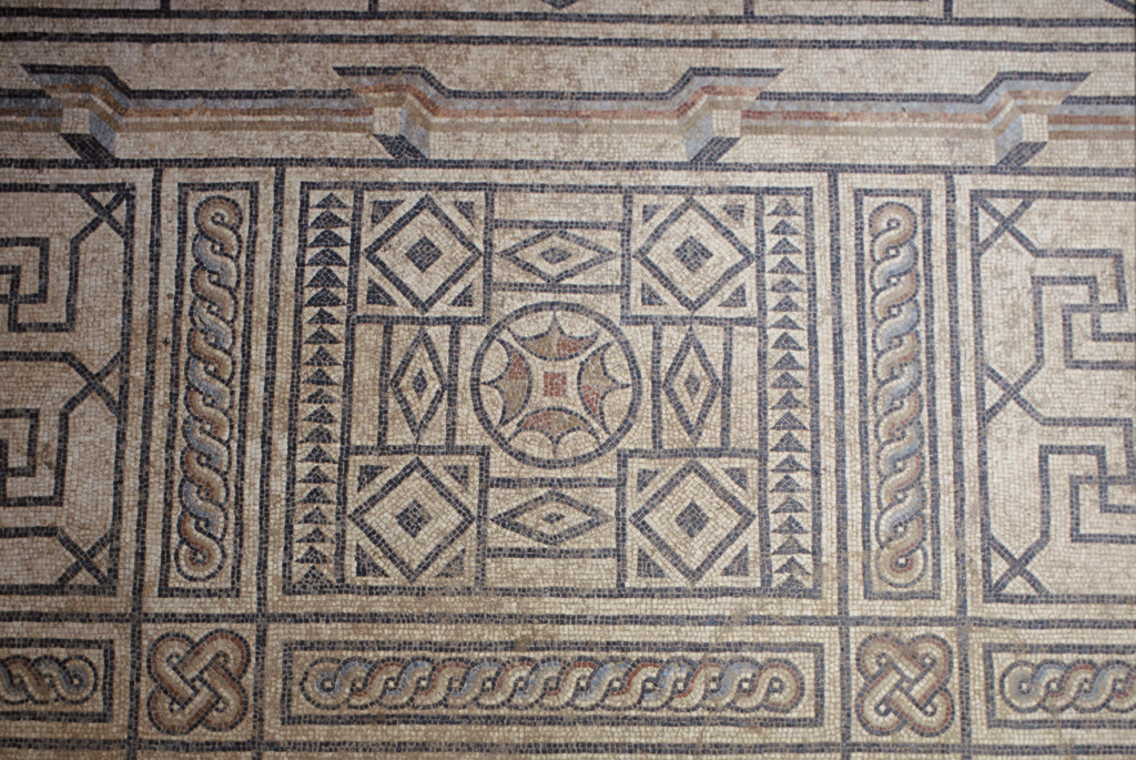 Détail d'un des décors géométriques polychromes qui encadrent la scène du combat d'Entelle et Darès.
