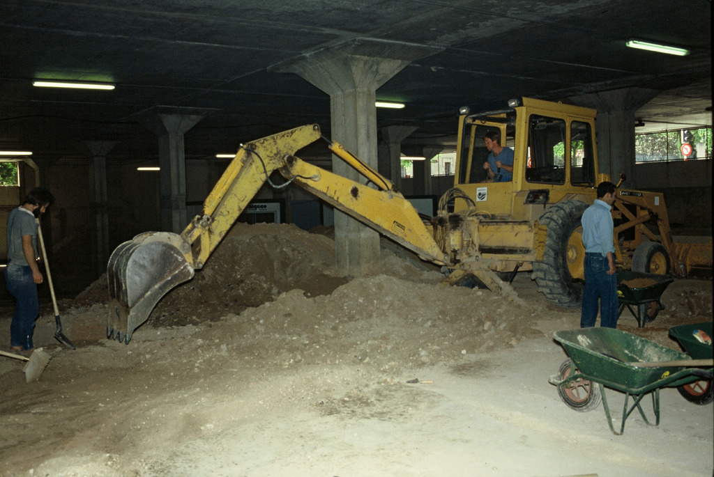 Vue générale du dégagement à la pelle mécanique lors des fouilles du Parking Pasteur en 1985. Aire du Chapitre.