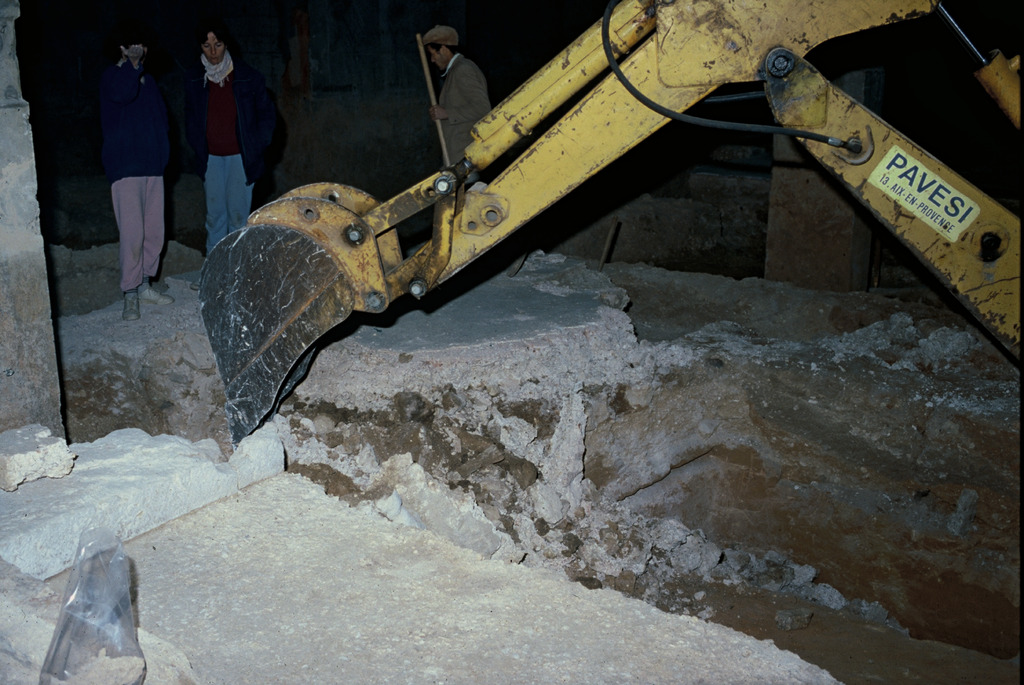 Détail du démontage de la pièce 14 : travail de démontage à la pelle mécanique.