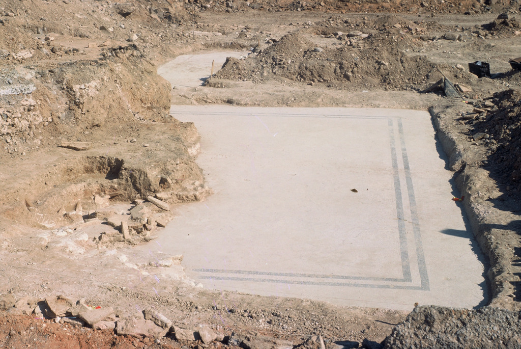 Vue rapprochée des sondages de reconnaissance effectués en 1976 à l'emplacement des piliers du parking mettant au jour des murs, des sols en béton et sept pavements en mosaïque blanche qui attestent du développement, au sud, de nouveaux corps de bâtiments résidentiels : domus : pavement de mosaïque blanche à double listel d'encadrement noir.