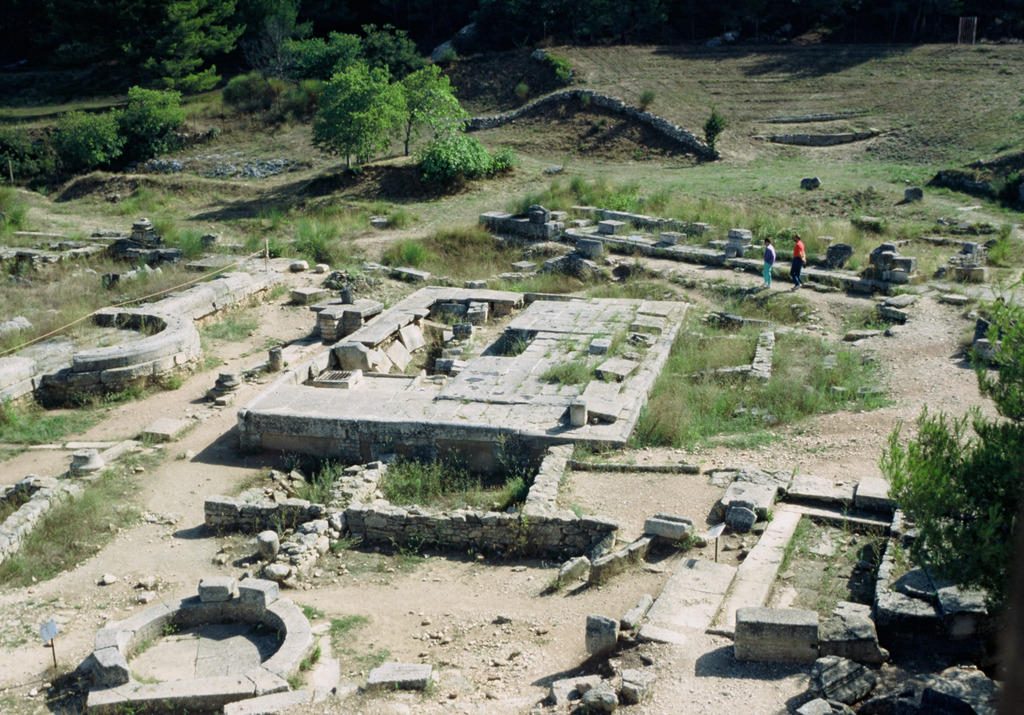 Vue prise de l'est : au premier plan une construction ronde hellénistique, puis la plate-forme dallée (ou autel monumental XXVII) construite sur un ancien puits sacré. Enfin sur la gauche on peut voir une abside délimitant la cour du forum au sud. Elle contenait certainement une statue.