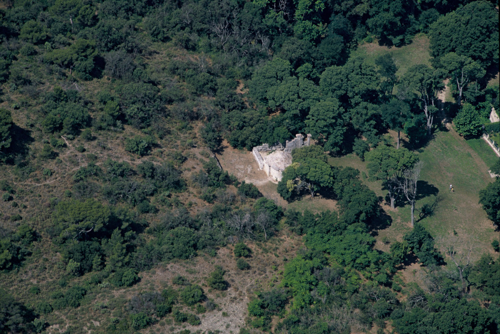 Temple romain et chapelle du Moyen-Age, vue aérienne.
