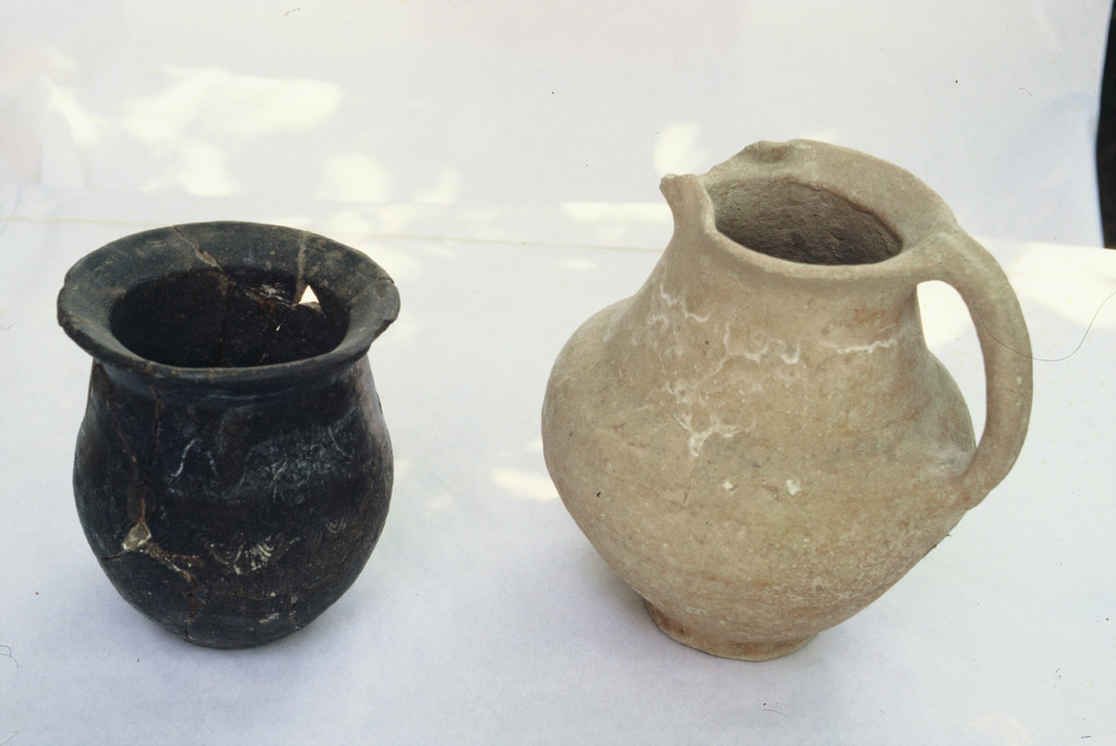 Vue rapprochée d'une céramique indigène modelée : urne et cruche.